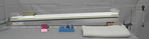 (50 g holds glider on 1.2 m track elevated 10 cm) (put tarp on floor to catch hanging mass, remove pulley during transport) |