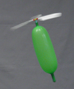 A balloon pushes air through a hollow propeller, causing it to spin and produce lift.