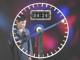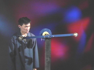 | A bar with movable weights on each end, attached to a pulley with a cord wrapped around it, rotates when a mass is hung from the cord. (Disc 6-1, 1 min. 52 sec.) |