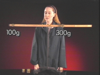 A meter stick suspended at its center is used as a torque balance. (Disc 4-14, 1 min. 2 sec.)