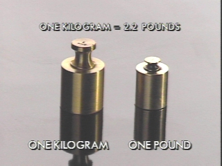 | A meter stick is compared to a yardstick, and a kilogram mass is compared with a one-pound weight of the same material. (Disc 1-1, 1 min. 4 sec.) |