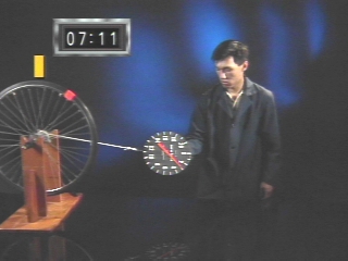 | A spring scale hooked to a cord which is wrapped around the axle of a bike wheel, is pulled with constant force to accelerate the wheel. (Disc 6-2, 45 sec.) |