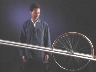| A wheel with an axle that can be locked is used to demonstrate conversion of gravitational potential energy to either rotational or translational kinetic energy. (Disc 6-6, 58 sec.) |