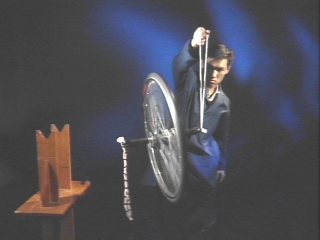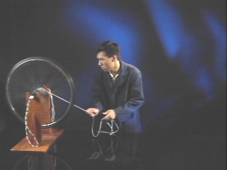 | A spinning bike wheel precesses in one direction when supported at one end of the axle, and in the other direction when supported by the other end. (Disc 7-10, 41 sec.) |