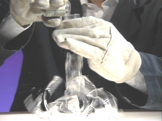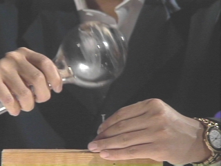 | A specially made glass bottle can be used to pound a nail, but shatters when scratched on the inside. (Disc 8-9, 1 min. 15 sec.) |