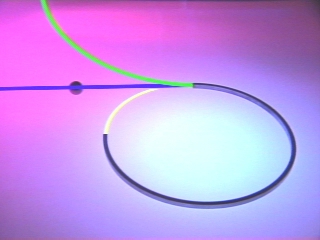 The tangential path followed by an object released from circular motion is shown. (Disc 5-14, 28 sec.)