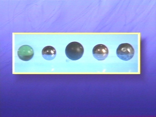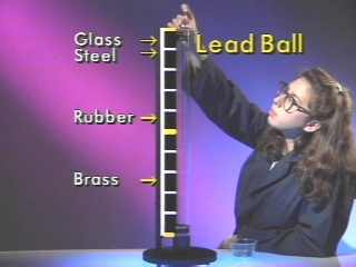 | Several balls are dropped on a steel plate, and the heights of their bounces are compared. (Disc 5-4, 58 sec.) |