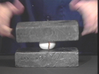 | An apparatus that distributes a force over a larger area keeps an egg from being crushed by several lead bricks. (Disc 4-21, 1 min. 15 sec.) |