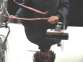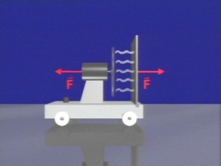 | When a fan mounted on a car blows air, the car reacts by moving in the opposite direction. When a sail is placed in front of the fan, the car does not move, but a separate fan blowing on the sail does move the car. (Disc 2-21, 49 sec.) |
