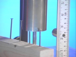 | A pile driver apparatus drives nails further into a board as the drop height increases. (Disc 3-7, 54 sec.) |