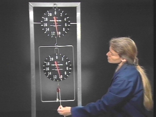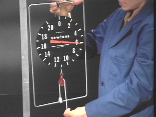 | A counterintuitive demonstration is used to check the students' understanding of how a pulley works. (Disc 4-5, 59 sec.) |