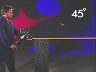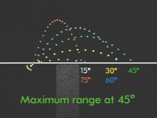 | Projectiles are shot with the same muzzle velocity at different angles, and their range compared. (Disc 2-6, 27 sec.) |