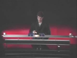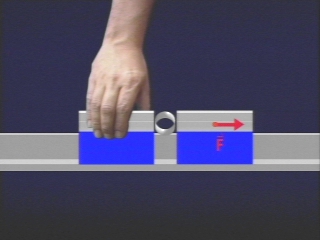 | Two identical air track gliders held together with a compressed spring between them, spring apart at equal speed when released. (Disc 2-18, 52 sec.) |
