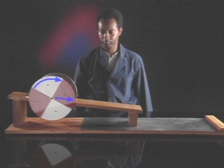 | A spool rolling down a ramp demonstrates energy conversion from gravitational potential energy to rotational and translational kinetic energy. (Disc 6-5, 48 sec.) |