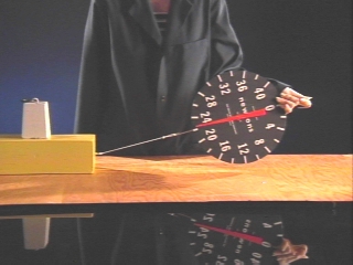 | A scale pulling a weighted board demonstrates that the coefficient of static friction is greater than the coefficient of dynamic or sliding friction. (Disc 3-2, 43 sec.) |