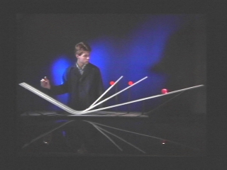 | A ball released at the top of three different tracks rises to the same height regardless of the angle of the track, demonstrating conservation of mechanical energy. (Disc 3-15, 1 min. 10 sec.) |