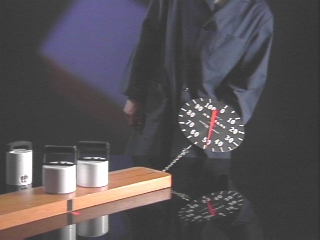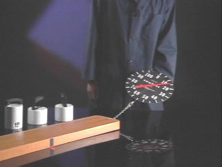 | A board is pulled along a horizontal surface by a rope attached to a spring scale, measuring the kinematic frictional force. Weights are then added to the board to determine the change in frictional force. (Disc 3-4, 1 min. 7 sec.) |