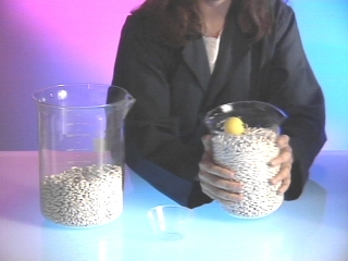 | A heavy ball sinks, and a light ball rises when the beaker of beans they are in is shaken. (Disc 12-16, 30 sec.) |