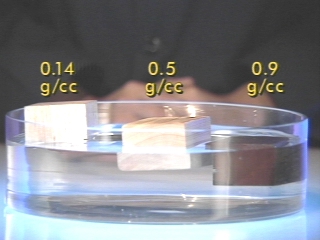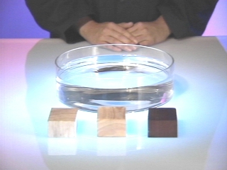 | Three blocks of wood float at different levels in water due to their different densities. (Disc 12-14, 42 sec.) |