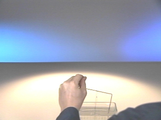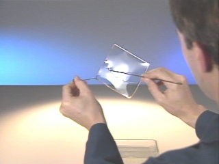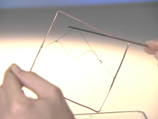| A loop of thread attached to a wire frame forms a circle when surrounded by a soap film. (Disc 13-24, 34 sec.) |