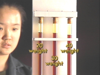 | Viscosity is demonstrated by observing the speed of air bubbles through motor oils of different weight. (Disc 14-6, 50 sec.) |