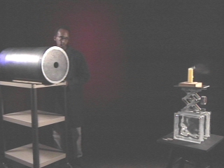 | A vortex cannon is used to create smoke rings and blow out a candle. (Disc 13-7, 48 sec.) |