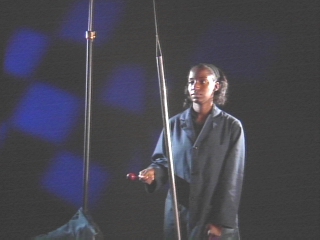 | A metal bar hanging from a string is struck in several locations to find its "sweet spot", where extraneous oscillations are minimized. (Disc 6-12, 44 sec.) |