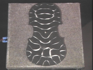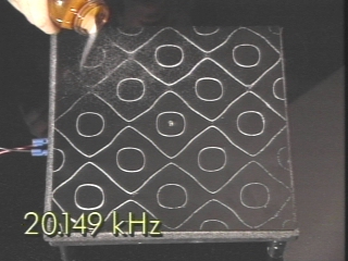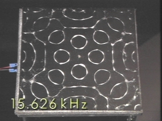 | Sand sprinkled on a vibrating plate drifts to the nodal lines, revealing the standing wave pattern produced by each of several frequencies. (Disc 9-30, 1 min. 50 sec.) |