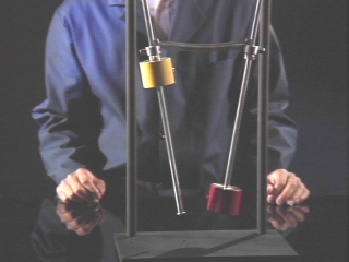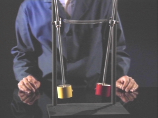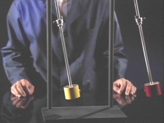| Two pendulums coupled by a spring transfer energy back and forth. (Disc 9-7, 1 min. 58 sec.) |