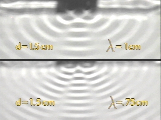 | A ripple tank with an adjustable double slit in a barrier is used to illustrate double slit interference. (Disc 9-22, 48 sec.) |
