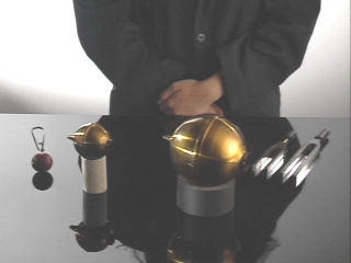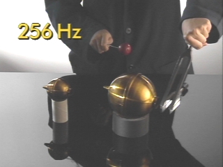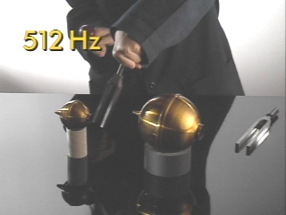 | The sound made by a tuning fork is amplified when it is held next to a Helmholtz resonator with the same resonant frequency. (Disc 11-9, 1 min. 6 sec.) |