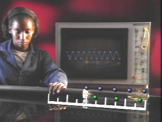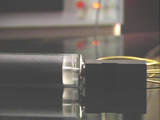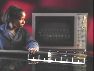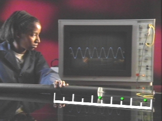 | A glass tube has a speaker at one end and a movable piston with a microphone at the other end that is used to map resonant points in the tube at two frequencies. (Disc 11-1, 2 min. 55 sec.) |