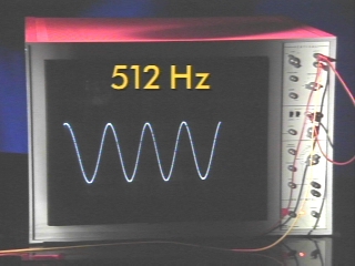 | Three tuning forks are sounded, and their sinusoidal waveforms are displayed on an oscilloscope. (Disc 10-3, 44 sec.) |