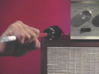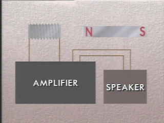| A coil wrapped around a soft iron core is connected to an amplifier and speaker. When a bar magnet is brought close the changing the magnetic domains can be heard. (Disc 19-19, 38 sec.) |