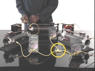 | Kirchhoff's current law is demonstrated using three ammeters at a circuit node. (Disc 17-27, 51 sec.) |