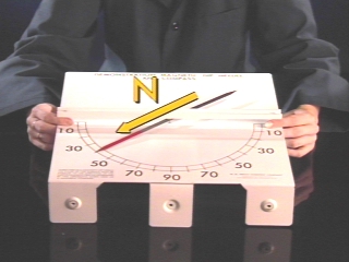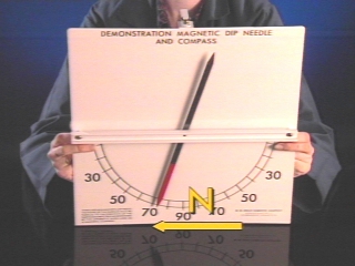 | A dip needle is used to show that the actual magnetic pole is far below the surface of the Earth. (Disc 19-3, 33 sec.) |