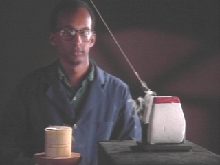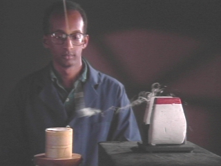 | Dysprosium metal, which has a very cold Curie point, is momentarily attracted to a strong magnet after it has been cooled in liquid nitrogen. (Disc 19-23, 1 min.) |