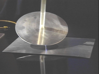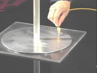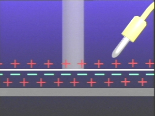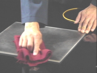 | An aluminum plate is charged by electrostatic induction each time it is set on a plastic sheet that has been charged by rubbing with a wool cloth. Animated graphics explain the charging process. (Disc 17-3, 1 min. 33 sec.) |