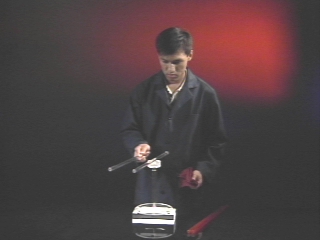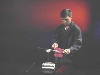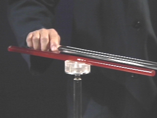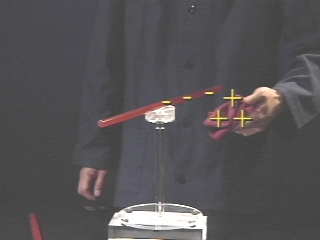 | The residual charge on a wool cloth attracts acrylic and rubber rods on a pivot. (Disc 16-22, 50 sec.) |