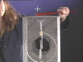 | An electroscope is not affected by a charged rod when it is inside a Faraday cage. (Disc 17-14, 42 sec.) |