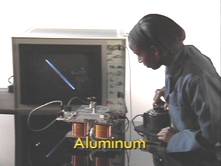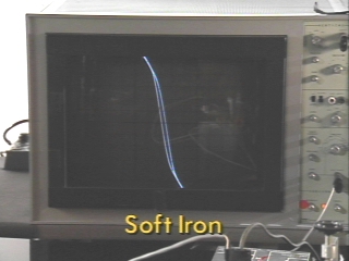 | Bars of soft iron and steel are placed on a transformer core and their hysteresis curves are displayed on an oscilloscope. (Disc 20-28, 1 min. 21 sec.) |