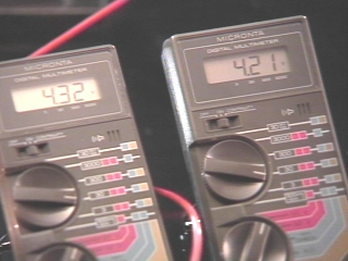 | Two sets of batteries have approximately the same open circuit voltage, even though one set is dead. When both are connected to lamps, the voltage of the dead batteries drops to 0 V. (Disc 18-3, 30 sec.) |