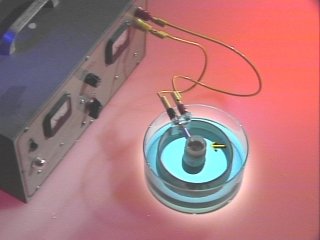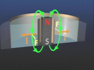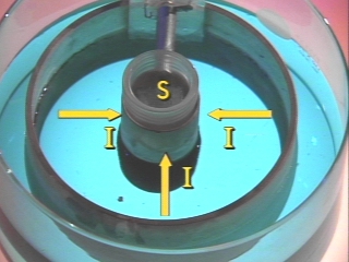 | An electric current flows in a copper sulfate solution in a magnetic field, causing the solution to spin. (Disc 20-6, 1 min. 20 sec.) |