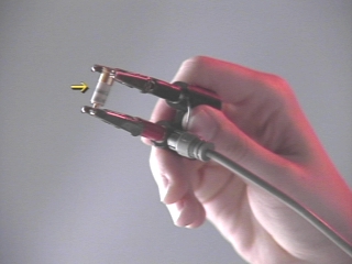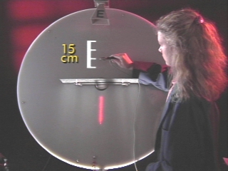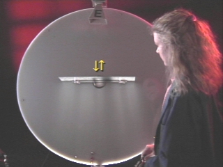 | A diode connected to an LED bar graph display illuminates a standing wave pattern from a microwave emitter. (Disc 21-15, 49 sec.) |