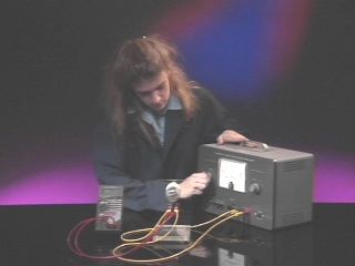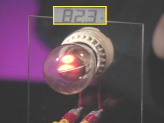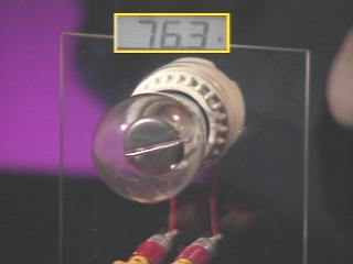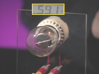 | The different on and off voltages of a neon bulb are displayed on a digital multimeter. (Disc 18-8, 42 sec.) |