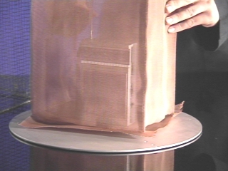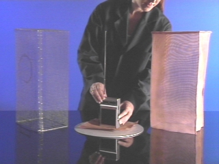 | A coarse mesh metal cage placed over a radio partially blocks the signal while a fine mesh cage completely blocks it. (Disc 21-17, 57 sec.) |