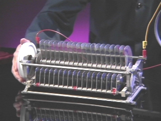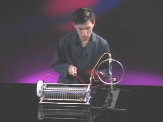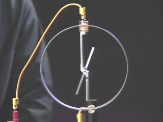 | An electroscope monitors the voltage on a rotary capacitor as the plates are rotated. (Disc 18-21, 1 min.) |