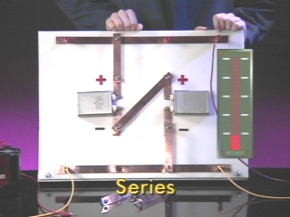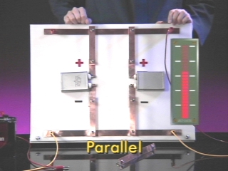 | Two identical capacitors are connected in different arrangements and their discharge rates compared using a graphical representation of a galvanometer. (Disc 18-27, 1 min. 37 sec.) |