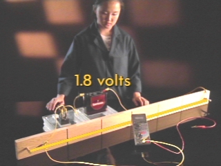 | The voltage is measured at several points along a resistance wire to show the uniform voltage drop. (Disc 18-1, 1 min. 11 sec.) |