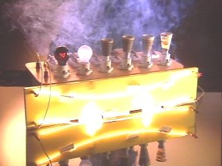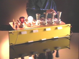 | Heater filaments overload a circuit made of resistance wire, dimming lamps and setting fire to paper strips. (Disc 18-5, 46 sec.) |
